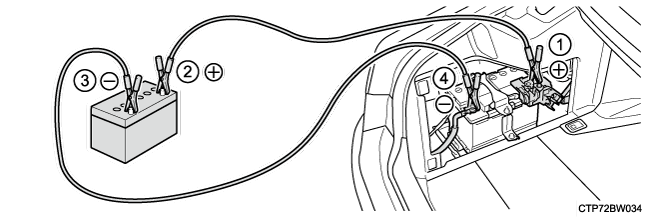- 補機バッテリーの+端子のカバーをはずし、ブースターケーブルを次の順につなぐブースターケーブルは、指定の端子に届くものを使用してください。