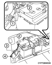 ボデー側に接続された補機バッテリーの-端子をはずさないでください。誤ってはずすと+端子と接触し、重大な傷害におよぶか、最悪の場合死亡につながるおそれがあります。