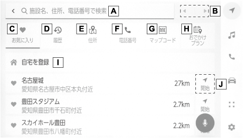 - 目的地履歴(過去に設定した目的地)の地点のリストを表示します。(→履歴で目的地を検索する)目的地履歴が存在するときのみ使用できます。