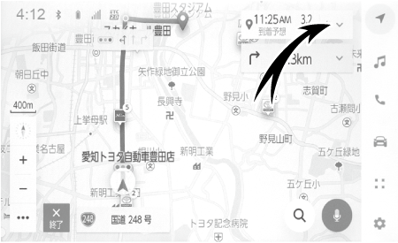 地図画面で[]にタッチします。[ルートオプション](→ルートオプションを変更する)または[他の経路](→他の経路に変更する)にタッチします。再探索する条件にタッチします。[OK]または[決定]にタッチします。