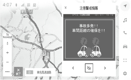 進行方向先の交通状況を画面表示と音声、または音声のみで案内します。