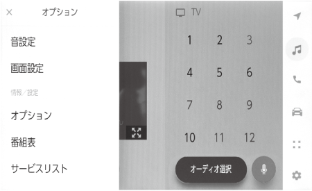 - 必要に応じて、各項目を設定します。[サービスリスト]:サブチャンネル放送をしているときにタッチすると、その番組をサブメニューに表示します。[メール]:マルチメディアシステムからのお知らせを確認できます。