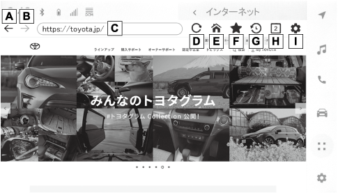 Web ブラウザ画面の操作は表示されているページ項目へのタッチ操作、またはWeb ブラウザ画面の上部にあるツールバーで行います。