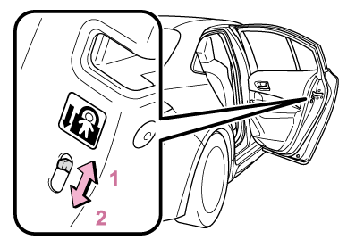 お子さまをリヤ席に乗せるときは、チャイルドプロテクターを使用して車内からドアが開かないようにする