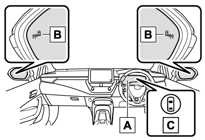 - ドアミラーインジケーター開いたドアと衝突する可能性がある車両・自転車を検知したときは、検知した側のドアミラーインジケーター(→表示灯一覧)が点灯します。検知している側のドアを開いた場合は、ドアミラーインジケーターが点滅します。
