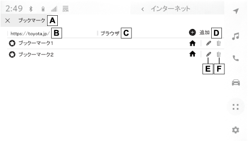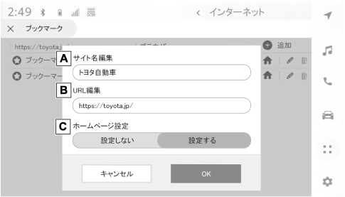 ブックマークの名称とURL の編集、ホームページへの設定をすることができます。