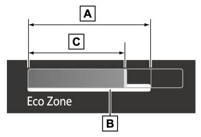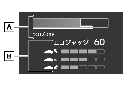 発進・安定走行などの各走行状況に適したアクセル操作範囲の目安が、エコエリア内に青色のバーで表示されます。