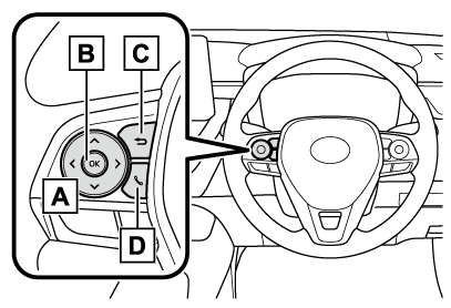 機能の作動内容を変更できる項目では、を押し続けることで、設定画面を表示できます。設定画面が表示されたら、メーター操作スイッチを操作して、いずれかの設定を選択、または時間などを希望の値に設定します。