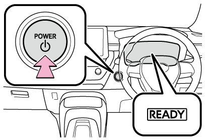 表示されないと、ハイブリッドシステムは始動しません。 - パワースイッチを短く確実に押す短く確実に押せば、押し続ける必要はありません。READY インジケーターが点灯すれば、ハイブリッドシステムは正常に始動しています。READY インジケーターが点灯するまでブレーキペダルを踏み続けてください。パワースイッチのどのモードからでもハイブリッドシステムを始動できます。