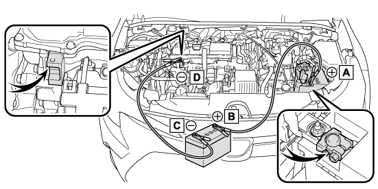 - 電子キーを携帯していることを確認するブースターケーブル接続時、場合によっては、オートアラームが作動し自動的にドアが施錠されます。(→オートアラーム作動によるドアロック機能)