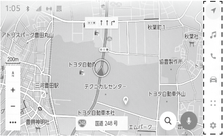 地図画面を表示します。目的地検索などナビゲーションに関する操作を行うことができます。(→地図画面表示, 地点情報を表示する