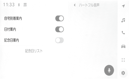 自宅到着時の「お疲れ様でした」や日付・曜日の案内などの音声を出力させることができます。