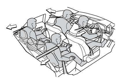前方・側方から強い衝撃を受けたとき、フロント席・リヤ外側席のシートベルトを引き込むことで適切な乗員拘束効果を確保します。