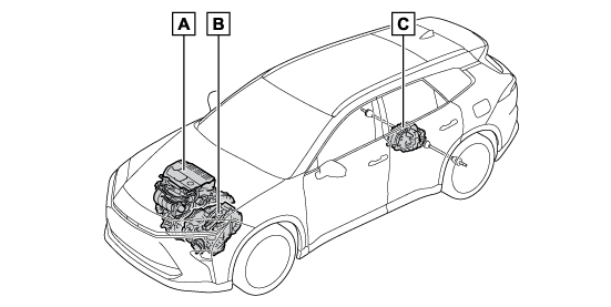 アクセルペダルを強く踏み込むと、ガソリンエンジンに加え、駆動用電池からも電気モーターに電力を供給し、電気モーターの出力を上げ、力強く加速します。