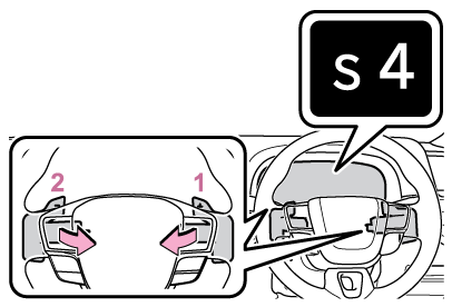 シフトポジションをSにすると、Sモードに切りかわります。パドルシフトスイッチの操作で思いどおりのシフトレンジを選択し、運転することができます。パドルシフトスイッチの「-」側または「+」側の操作でシフトレンジを選択することができます。