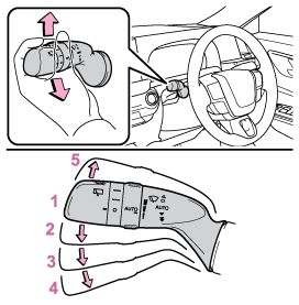 次のようにレバーを操作すると、ワイパーまたはウォッシャーが作動します。