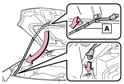 ボンネットステーをステー穴から取りはずし、クリップに正しくもどしてください。ステーを正しくもどさない状態でボンネットを閉めると、ボンネットやステーが損傷するおそれがあります。