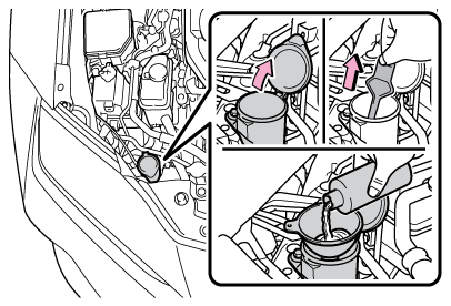 ハイブリッドシステムが熱いときやハイブリッドシステムが作動しているときは、ウォッシャー液を補充しないでください。