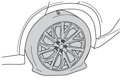 短い距離でもパンクしたタイヤで走行すると、タイヤおよびホイールが損傷し修理できなくなります。パンクした状態で走行を続けると、タイヤ側面に円周状の溝ができる場合があります。この状態で応急修理キットを使用すると、タイヤが破裂する危険があります。