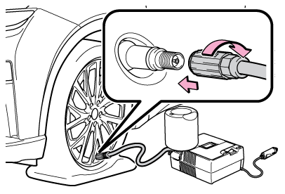 • タイヤを車両に取り付けた状態で、バルブとボトルのホースをしっかりと接続してください。ホースの接続が不十分な場合、空気がもれたり、パンク補修液が飛散したりするおそれがあります。