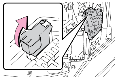 - ボンネットを開けて(→ボンネット)、ヒューズボックスのカバーをはずすツメを押しながらカバーを持ち上げる