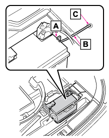 必ず-端子を先にはずしてください。+端子を先にはずすと、+端子が周辺の金属部分にふれた場合、火花が発生し火災につながるおそれがあるほか、感電し重大な傷害におよぶか、最悪の場合死亡につながるおそれがあります。