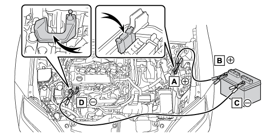 - 電子キーを携帯していることを確認するブースターケーブル接続時、場合によっては、オートアラームが作動し自動的にドアが施錠されます。(→オートアラーム作動によるドアロック機能)
