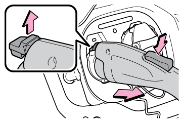 ロック解除ボタンを押してもレバーが上がらないときは、普通充電コネクターがロックされています。その場合は、スマートエントリー&スタートシステム、またはワイヤレスリモコンなどでドアの解錠操作をし、普通充電コネクターをアンロックしてください。(→充電リッド・普通充電コネクターのロック・アンロック