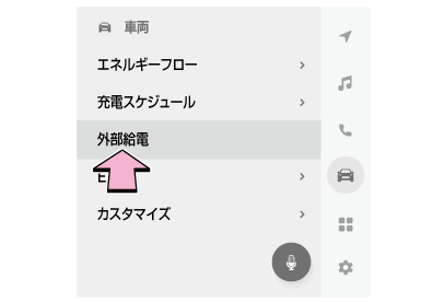 DC外部給電システムの使用中は、マルチインフォメーションディスプレイまたはマルチメディアディスプレイに外部給電中画面が表示され、外部給電可能時間などの情報を確認することができます。