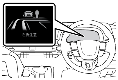 受信した情報は、状況に応じて通知・案内や注意喚起としてマルチインフォメーションディスプレイなどに表示され、運転者に注意を促すことにより安全運転を支援します。