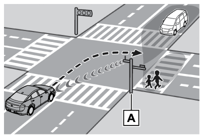 DSSS用路側装置が設置された交差点であっても、DSSS用路側装置の種類や交差点に進入する方向によっては、対向車のみを検知し、歩行者に対する注意喚起をしない場合があります。