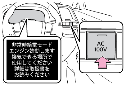災害などによる非常時に電力が必要なとき、車両の走行機能を停止した状態で、AC100Vで消費電力の合計が1500W 以下の電気製品を使用することができるシステムです。(→非常時給電システムを使用するには)