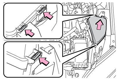 10. 救援用端子カバーを閉じ、ヒューズボックスのカバー、エンジンカバーをもとどおりに取り付ける