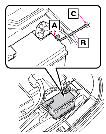 必ず-端子を先にはずしてください。+端子を先にはずすと、+端子が周辺の金属部分にふれた場合、火花が発生し火災につながるおそれがあるほか、感電し重大な傷害におよぶか、最悪の場合死亡につながるおそれがあります。