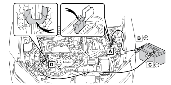 ブースターケーブルは、指定の端子および接続箇所に届くものを使用してください。