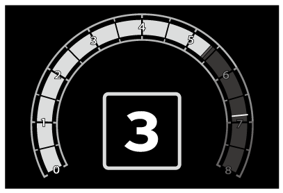 設定したエンジン回転数に到達したときは橙色、レッドゾーンに到達したときは赤色で表示されます。