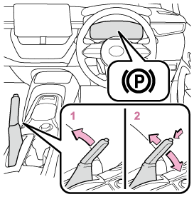 - パーキングブレーキを解除するには、レバーを少し引上げ、ボタンを押しながら完全に下までもどす