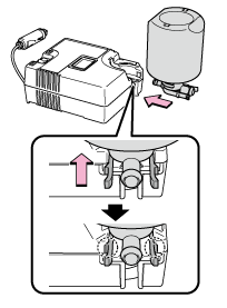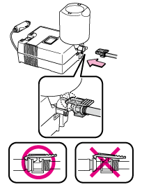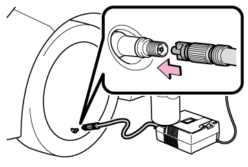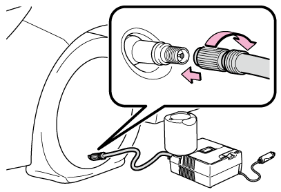 タイヤを車両に取り付けた状態で、バルブとホースをしっかりと接続してください。ホースの接続が不十分な場合、空気がもれたり、パンク補修液が飛散したりするおそれがあります。