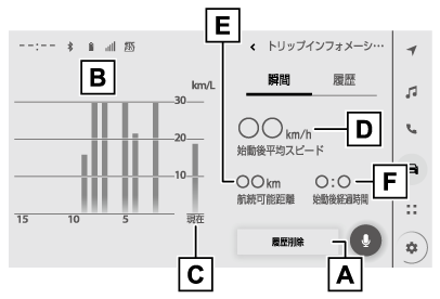 “履歴削除”を選択すると、燃費データがリセットされます。