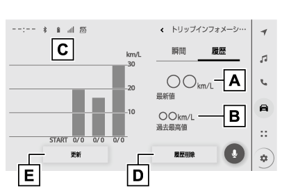 燃費履歴画面で“更新”を選択すると、平均燃費の値とグラフが更新され、新たに平均燃費の記録を開始します。