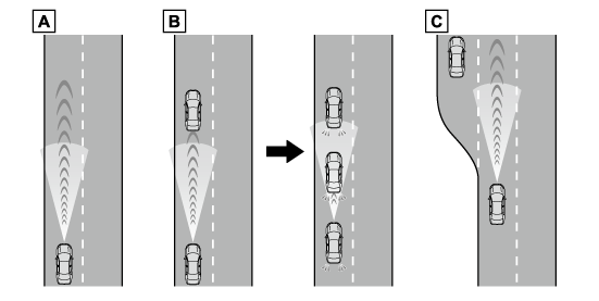 車両前方の先行車の有無・先行車との車間距離を判定して、先行車との適切な車間距離を確保する制御をします。また、車間距離切りかえスイッチを操作して、希望の車間距離に設定することもできます。