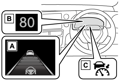 約80km/h以上で走行中に自車より遅い車両の後方へ車線変更する場合、方向指示レバーの操作と連動して緩減速することで、車線変更を補助します。