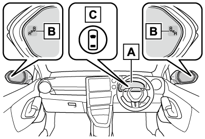 - ドアミラーインジケーター開いたドア(バックドアを除く)と衝突する可能性がある車両・自転車を検知したときは、検知した側のドアミラーインジケーター(→表示灯一覧)が点灯します。検知している側のドアを開いた場合は、ドアミラーインジケーターが点滅します。