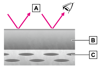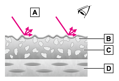 一般的なクリア塗装は表面が平らで滑らかになっています。平らな面に当った光は、鏡に当った光のように一方向に正反射する量が多いため、目に入る光の量は多くなります。そのため、私たちの目には車のボデーに艶があるように映ります。