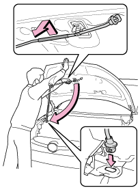 ボンネットステーをステー穴から取りはずし、クリップに正しくもどしてください。ボンネットステーが挿し込まれた状態で閉めると、ボンネットが損傷するおそれがあります。