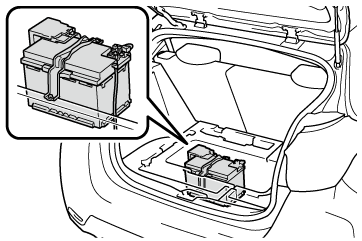 この車両のバッテリーは、ラゲージルーム(中央)のデッキボード下にあり、エンジンルームには搭載されていません。