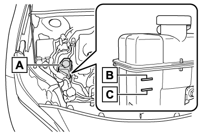 4. 冷却水の量がリザーバータンクの“FULL”(上限)と“LOW”(下限)のあいだにあるかを点検する