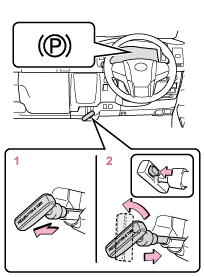 - パーキングブレーキを解除するレバー裏側にあるボタンを押しながら左にまわし完全に奥までもどしてください。