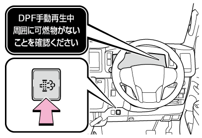 マルチインフォメーションディスプレイに“DPF 再生不十分 取扱書を確認し手動再生を実施ください” と表示されたときは、スイッチ操作で燃焼処理を行ってください。(→排出ガス浄化装置の警告メッセージが表示されたときは)