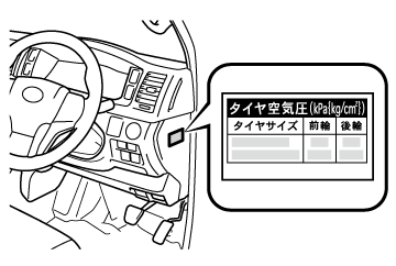 タイヤの指定空気圧は、インストルメントパネル横(運転席側)のタイヤ空気圧ラベルで確認することができます。